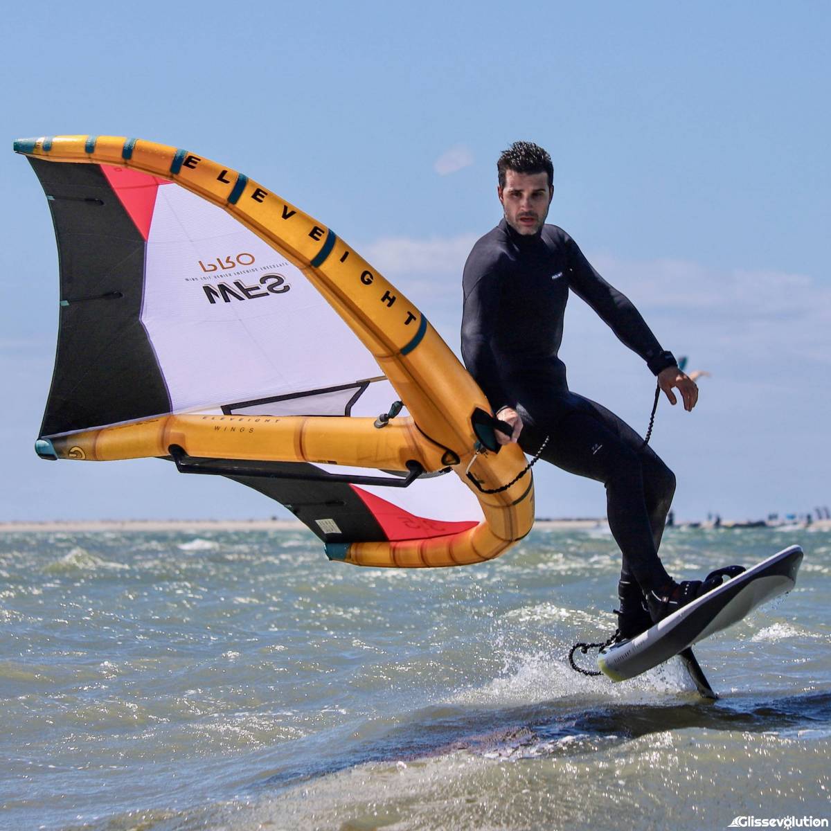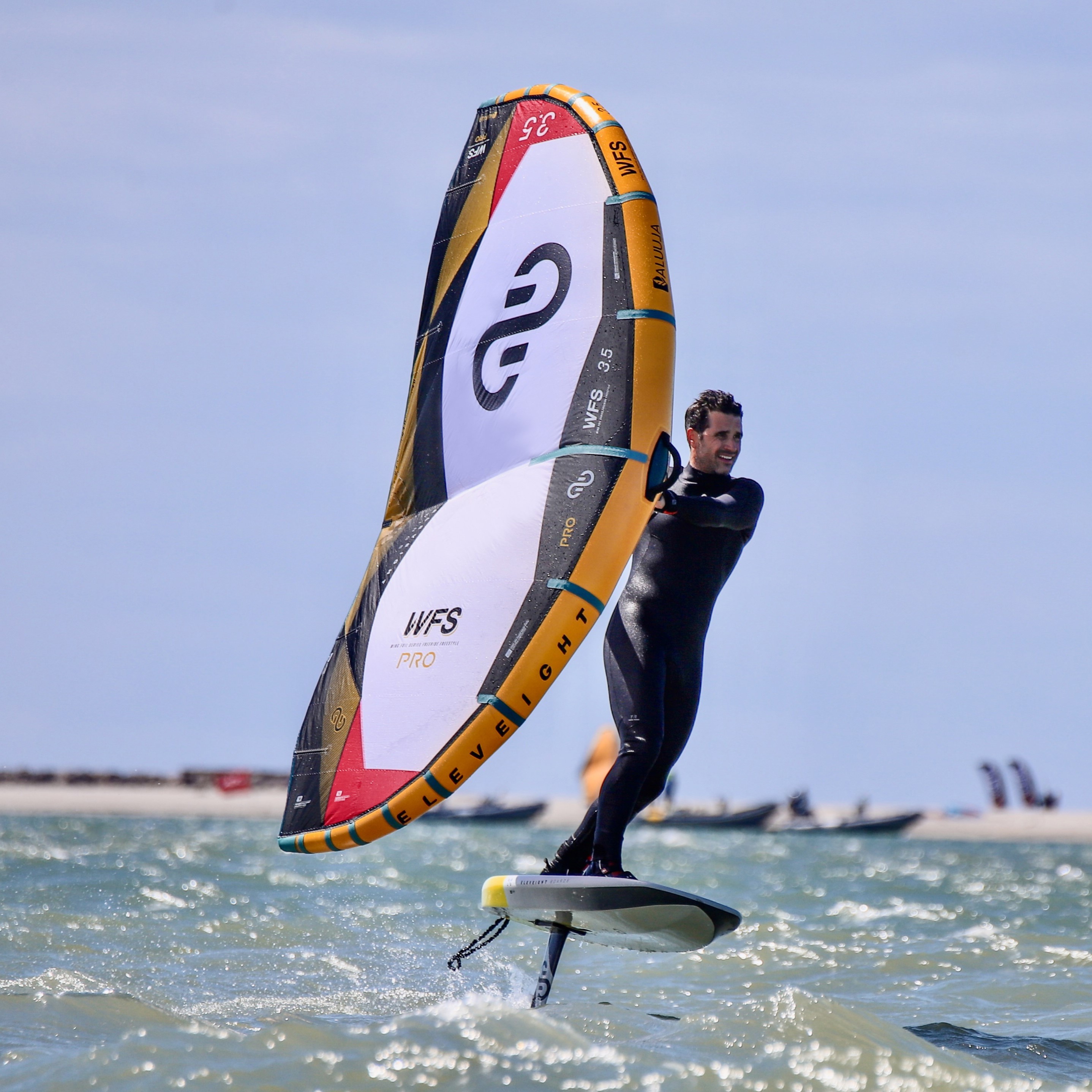 La toute nouvelle Eleveight WFS PRO impressionne dès qu’on la sort du sac (assez grand et très pratique au passage). Son design est moderne et épuré : l’ensemble blanc, noir et jaune avec une touche de rouge se marie parfaitement avec sa construction en Aluula. Une fois gonflée la toile est vraiment tendue, la voile est super légère grâce à son wishbone en carbone et à l’Aluula ce qui la rend hyper stable. Globalement le shape de la voile est compact et intuitif, elle se manie facilement et la puissance se trouve tout de suite.